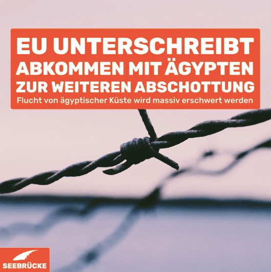 Ägypten ist ein Land, in dem es keine angemessene rechtliche Grundlage für den Schutz von fliehenden Menschen gibt. Es ist vollkommen menschenverachtend, das Leben von tausenden von Menschen aufs Spiel zu setzen, um sich der Verantwortung für fliehende Menschen zu entziehen. Wir sagen: keine Steuergelder für rassistische Abschottung, Fight Fortress Europe!