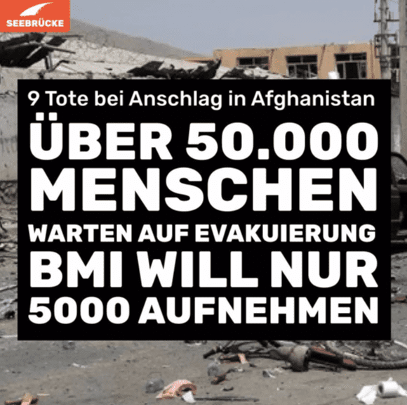 Über 50.000 Menschen warten auf ihre Evakuierung durch die Bundesregierung. Sie werden aktiv durch die Taliban verfolgt. Immer wieder müssen Menschen trotz Aufnahmezusage sterben, das BMI blockiert die Evakuierung aller bedrohter Menschen. Deutschland muss sich endlich zu seiner Verantwortung bekennen und gefährdete Menschen schnell und unbürokratisch evakuieren! Schutz für alle, die Schutz suchen!