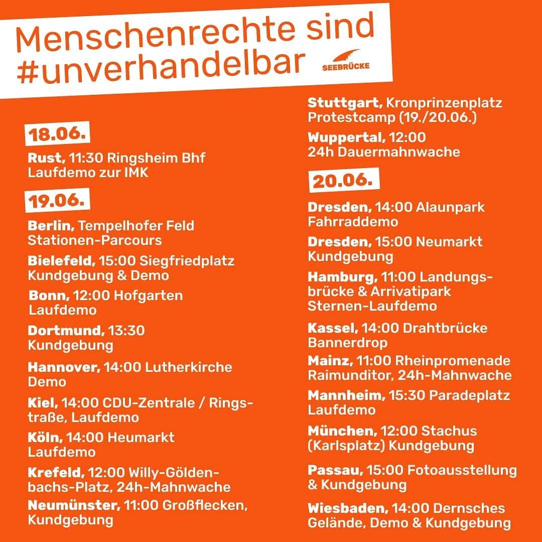 - 13.06.2021·News - Aktionswochenende: Menschenrechte sind #unverhandelbar- Nächste Woche startet unser Aktionswochenende unter dem Motto „Menschenrechte sind unverhandelbar!" In über 20 Städten werden unsere Lokalgruppen auf den Straßen sein und für Seenotrettung, die Evakui…