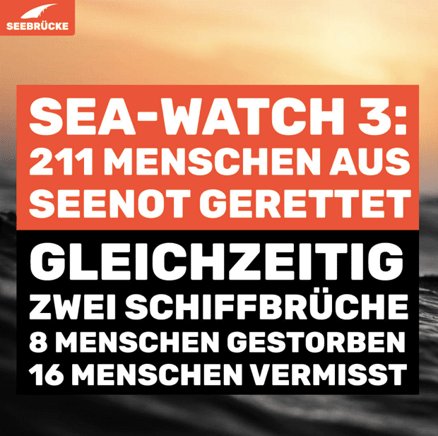 In nur 24 Stunden hat die Sea-Watch 3 in 5 Rettungseinsätzen 211 Menschen aus Seenot gerettet. Bei einem dieser Einsätze war das Schlauchboot bereits gesunken, dutzende Menschen waren im Wasser. Auch …